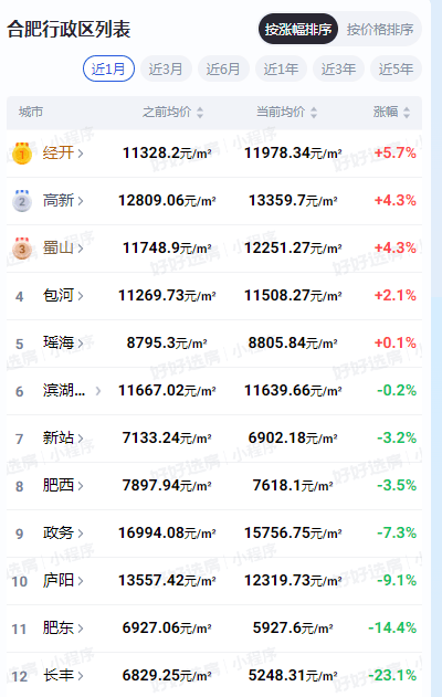 从价格维度观察,市场分化趋势更为明显。经开区以+5.7%的涨幅领跑,高新区与蜀山区紧随其后,均录得+4.3%的涨幅。这三个区域的共同特点是产业基础扎实、配套相对成熟、人口吸引力强。