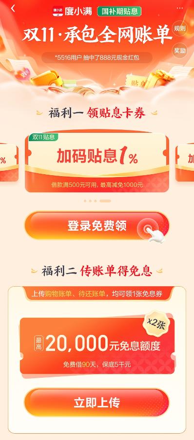 11月以来,度小满的“国补贴息”活动还在继续,面向特邀用户推出专项福利,主要包括“领贴息券”与“传账单得免息”两项举措。用户如果在9月、10月已领取贴息券并参与了相应的活动,11月的活动还可以继续参与,一年累计最高可节省1500元利息成本。