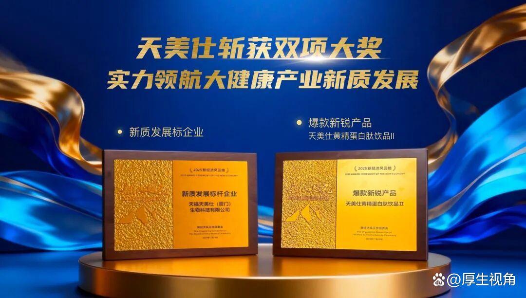 2025年11月18日,由权威机构主办的“2025新经济风云榜”圆满落幕。本次盛会聚焦新经济、新动能与新质生产力,汇聚了全国创新型企业代表与行业专家。在备受关注的评选中,天美仕凭借其在大健康产业的持续创新与高质量发展,脱颖而出,荣获大会颁发的“新质发展标杆企业奖”。同时,其明星产品——黄精蛋白肽饮品,也以卓越的市场表现与创新价值,成功摘得“爆款新锐产品奖”。双奖连珠,成为本届盛会中大健康领域的一大亮点。
