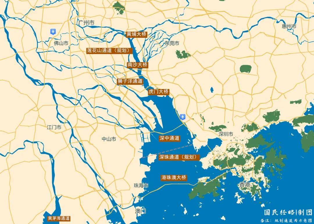 从硬联通来看,在珠江口,将有11座跨海大桥横贯其上,包括港珠澳大桥、深中通道、虎门大桥、南沙大桥,以及正在规划中的深珠通道,大幅压缩时空距离。