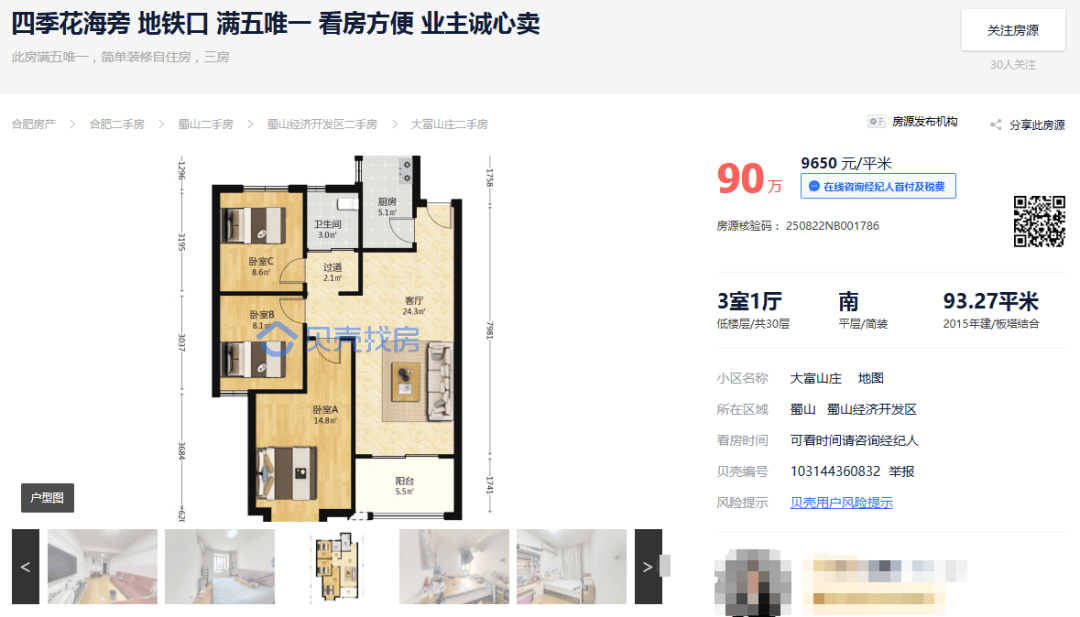 大富山庄,3室1厅,93.27㎡,挂牌价90万,单价约9650元/㎡