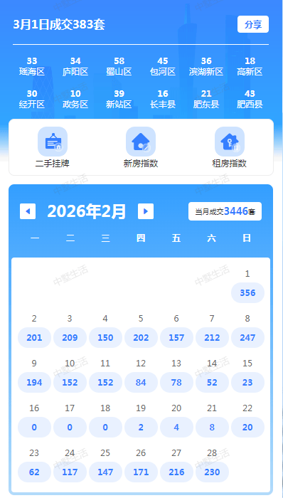 三月的第一天,合肥楼市交出了一份值得玩味的成绩单。3月1日全市二手房成交383套。放在传统楼市周期里,这个数字本身或许并不惊艳,但结合春节刚过的特殊时间节点,它传递出的信号远比数字本身更有分量——市场的齿轮已经开始加速转动。