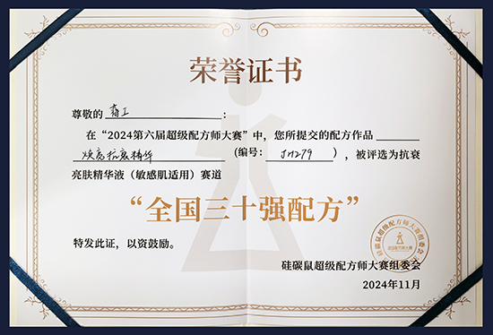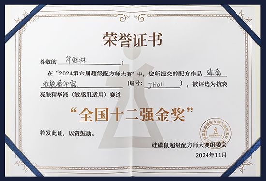 本次大赛吸引了全国各地500多位顶尖配方师人才,创作出近600款产品配方参与评比,竞争异常激烈。经过六个月的激烈角逐、线下百人严苛评测、带队导师团打分、第三方安全与功效检测、评审团感官评分及配方设计理念路演评分等多个环节,公司参赛配方师们从众多参赛者中脱颖而出,最终赵乐荣、牟维林两位选手荣获护肤赛道“全国十二强金奖”,蒋一博荣获护肤及洗护双赛道“全国三十强配方”,毕利顺荣获洗护赛道“全国三十强配方”。他们用实力证明了公司化妆品配方师在产品配方设计领域的高超水准,也展现了公司在日化配方开发领域的强大实力。
