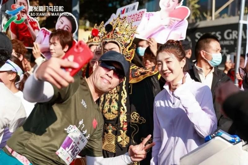 在全长42.195公里的经典环岛赛道中,陈梦亮相于15KM的度小满加油站为跑者们加油助力!