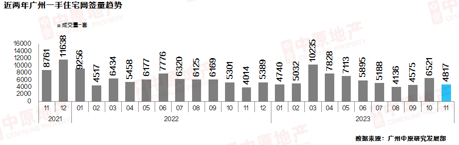 据广州中原研究发展部数据,供应放缓及优惠力度不到位,导致大量新房客户被二手住宅“虹吸”,11月新房成交呈现下滑状态。11月,广州新房网签4817套,环比下跌26%。