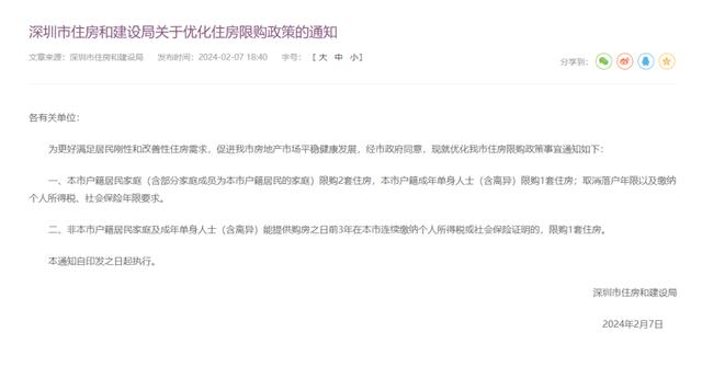 2月7日,深圳市住房和建设局发布关于优化住房限购政策的通知。具体来看,深圳本市户籍居民家庭(含部分家庭成员为本市户籍居民的家庭)限购2套住房,本市户籍成年单身人士(含离异)限购1套住房;取消落户年限以及缴纳个人所得税、社会保险年限要求。非本市户籍居民家庭及成年单身人士(含离异)能提供购房之日前3年在本市连续缴纳个人所得税或社会保险证明的,限购1套住房。通知自印发之日起执行。